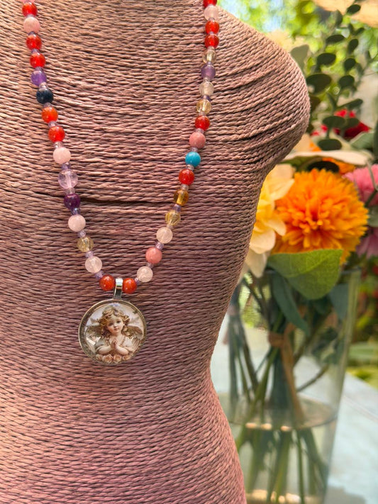 Ángel del amor en collar de gemas multicolores