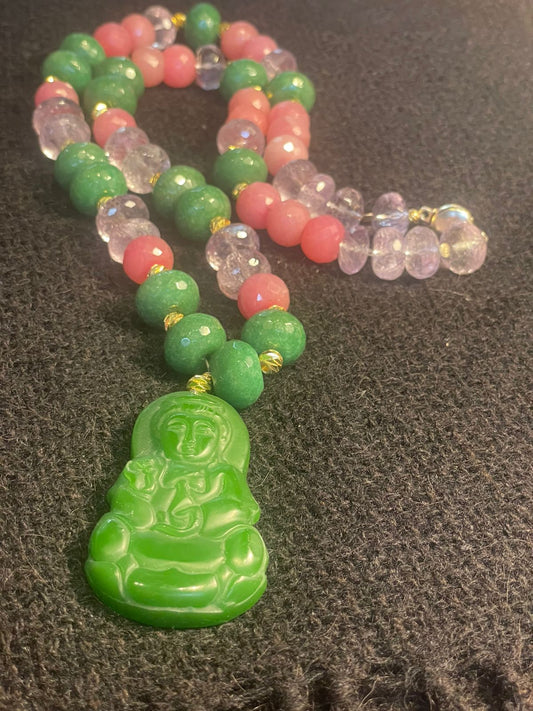 Collar de jade aventurina y un amatistas talismán de Kuan Yin