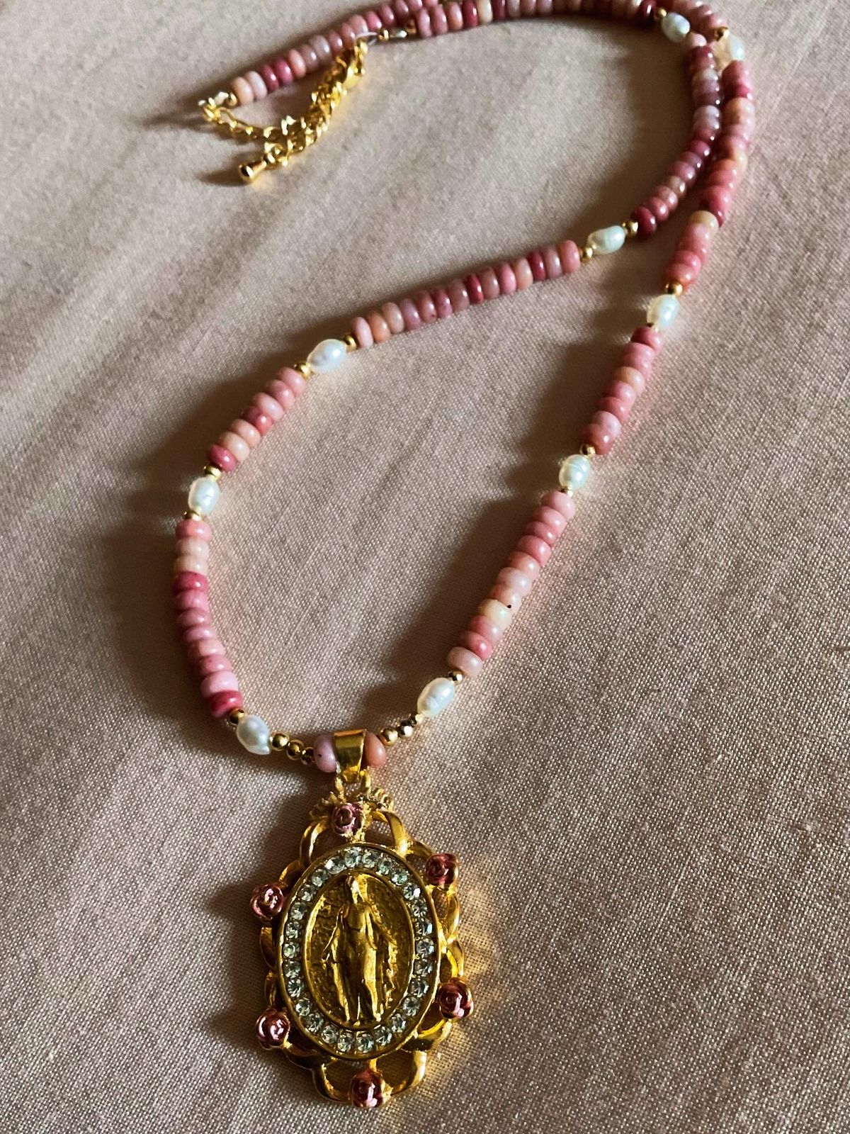 Rodocrosita y piedra luna medalla de la Virgen Milagrosa