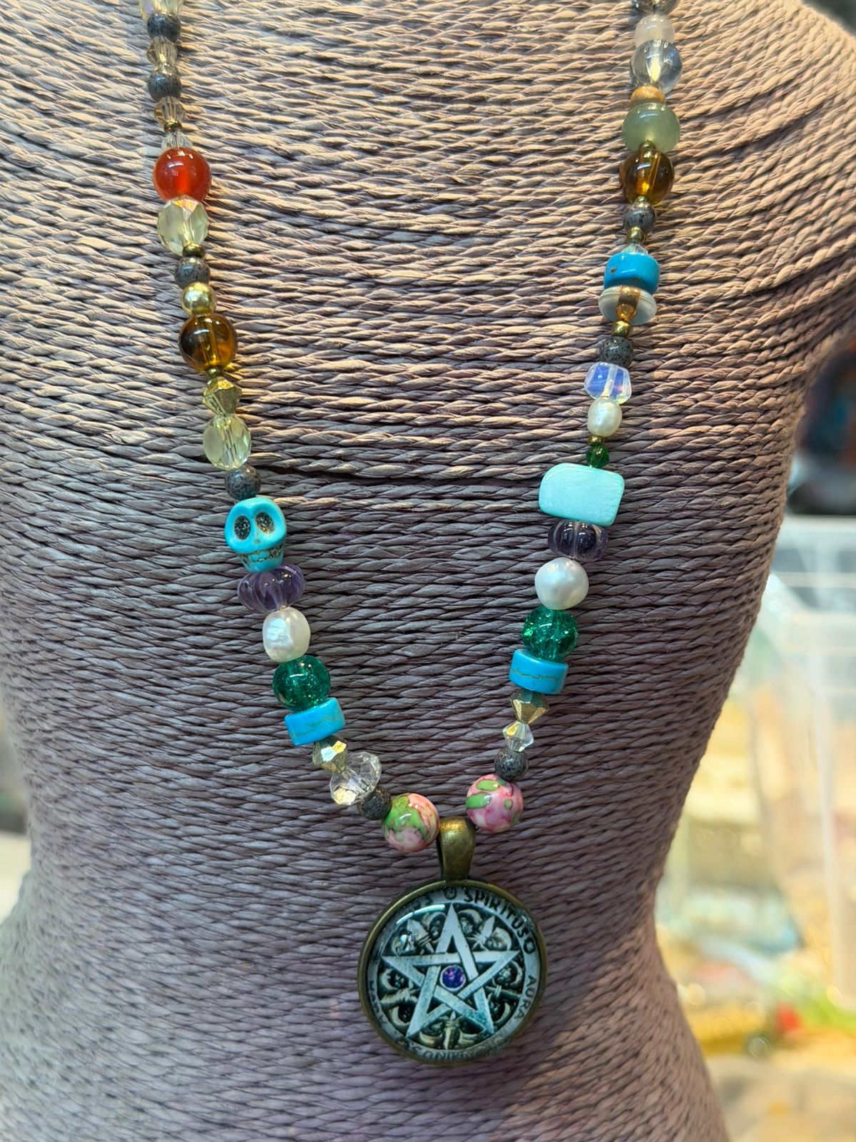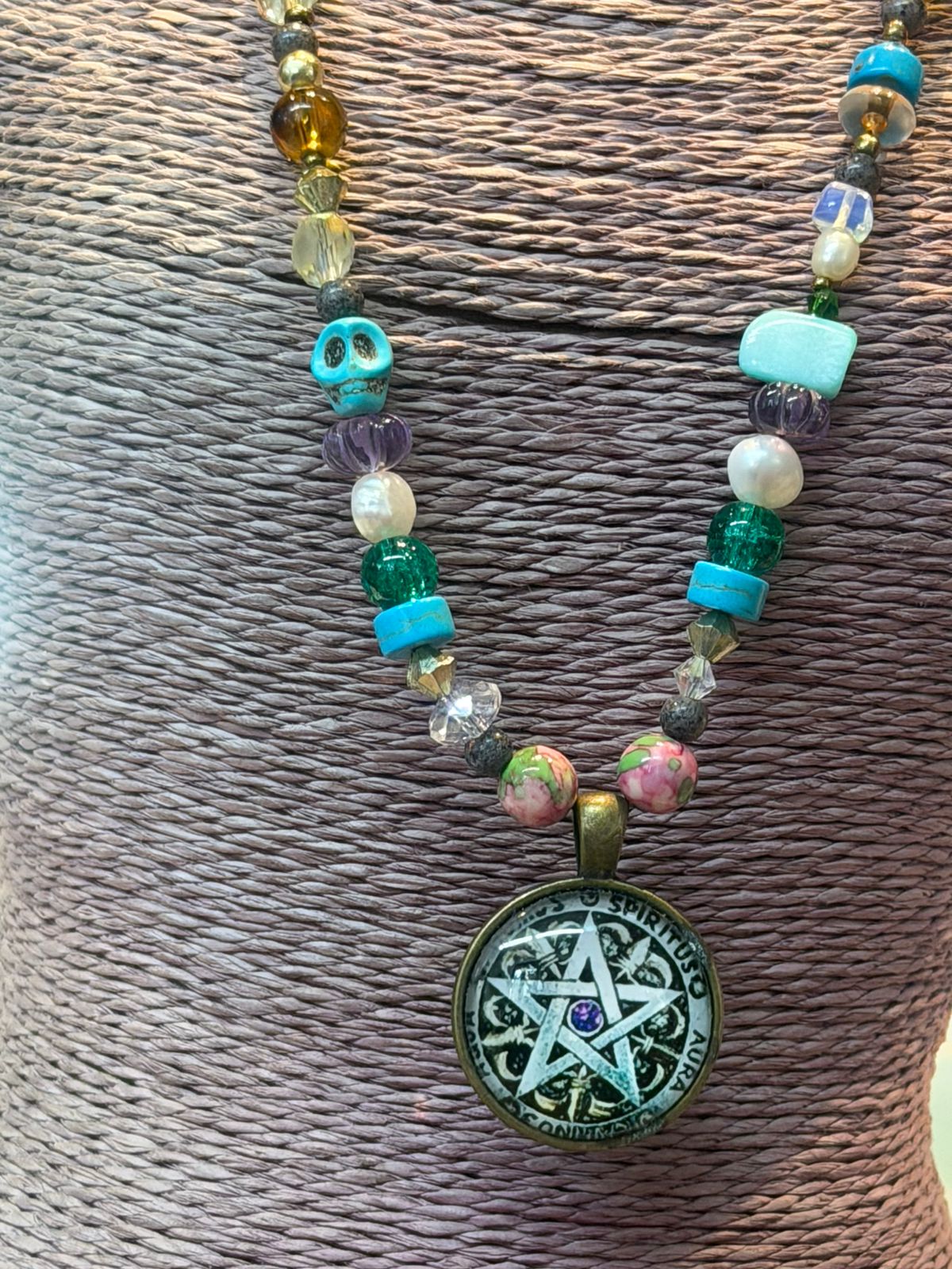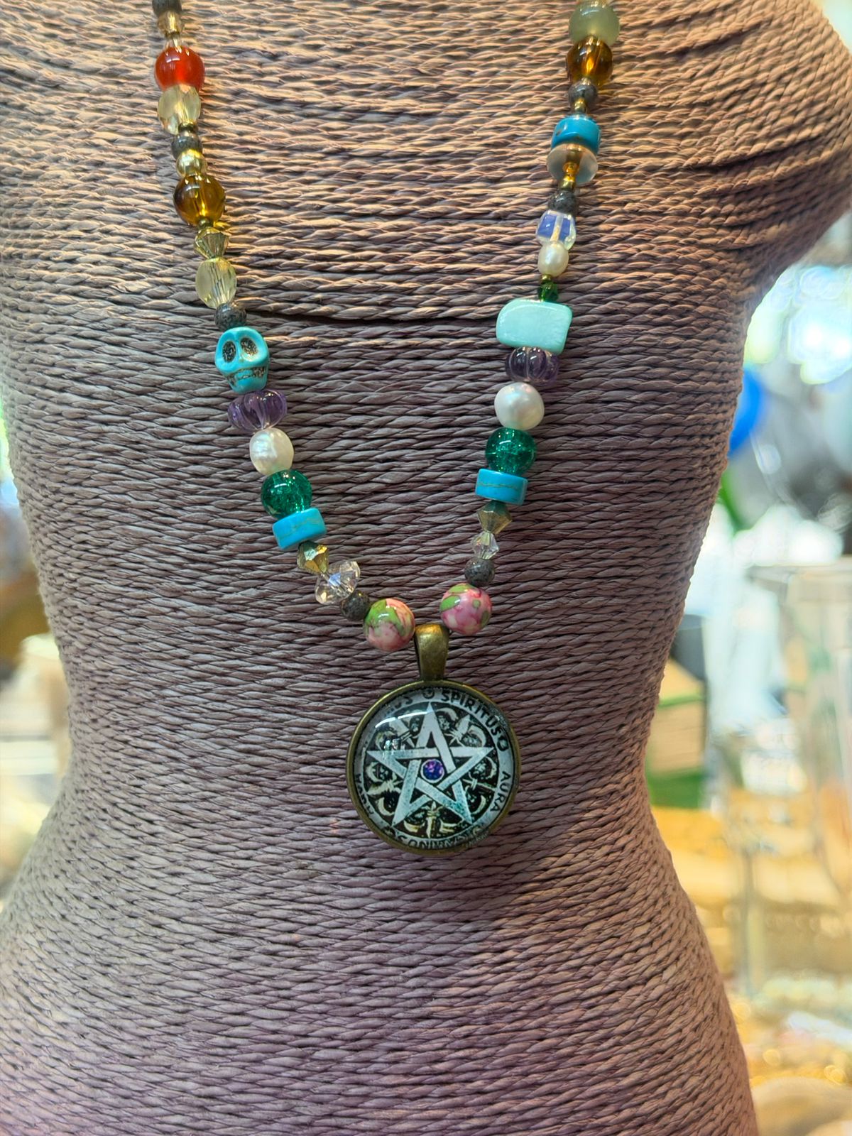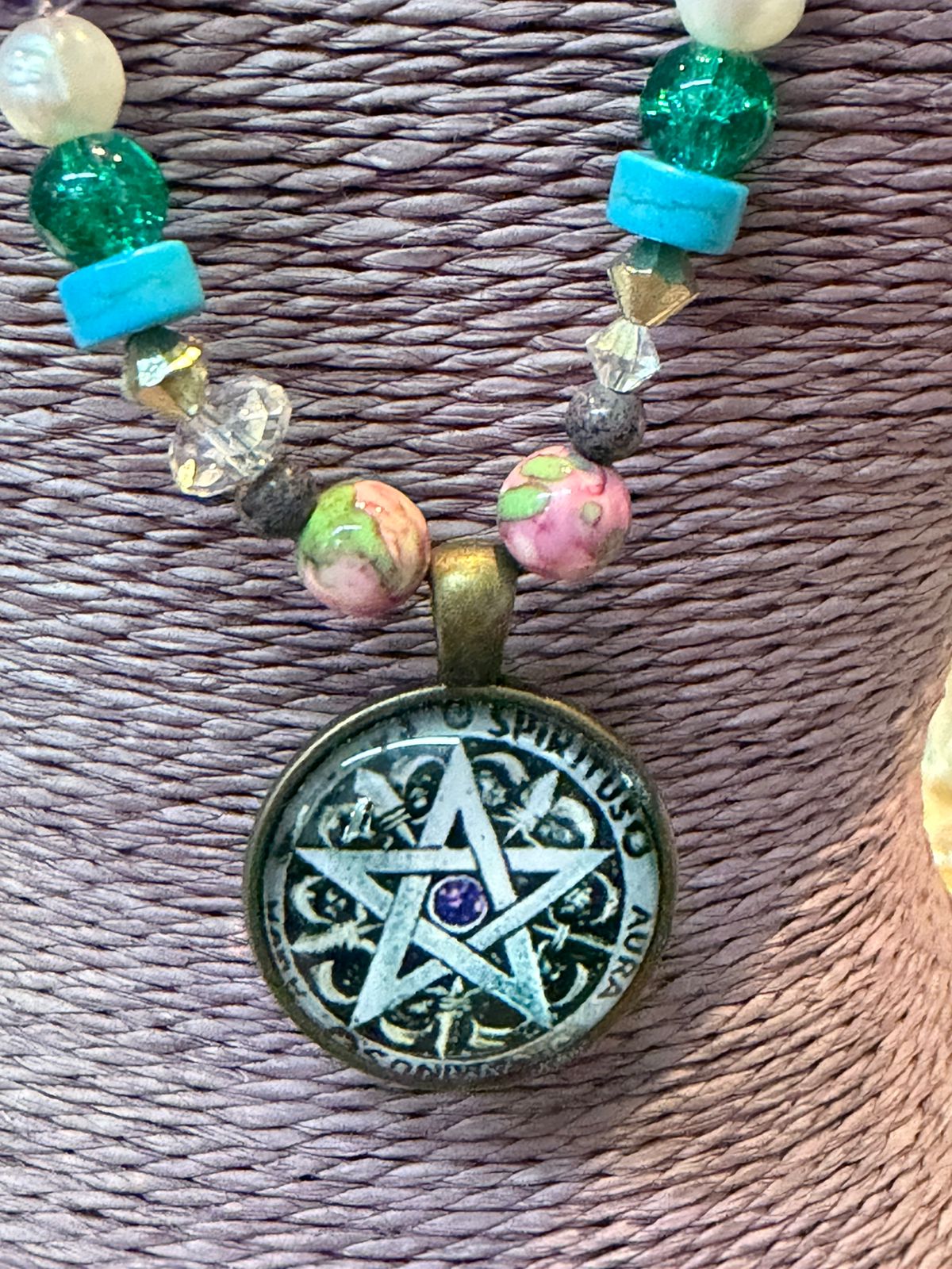 Un collar para una bruja verdadera, gemas coronadas en un pentáculo, que es una estrella de cinco puntas encerrada en un círculo ⭕. Cada punta representa uno de los cinco elementos, y el círculo simboliza la unidad y la protección: