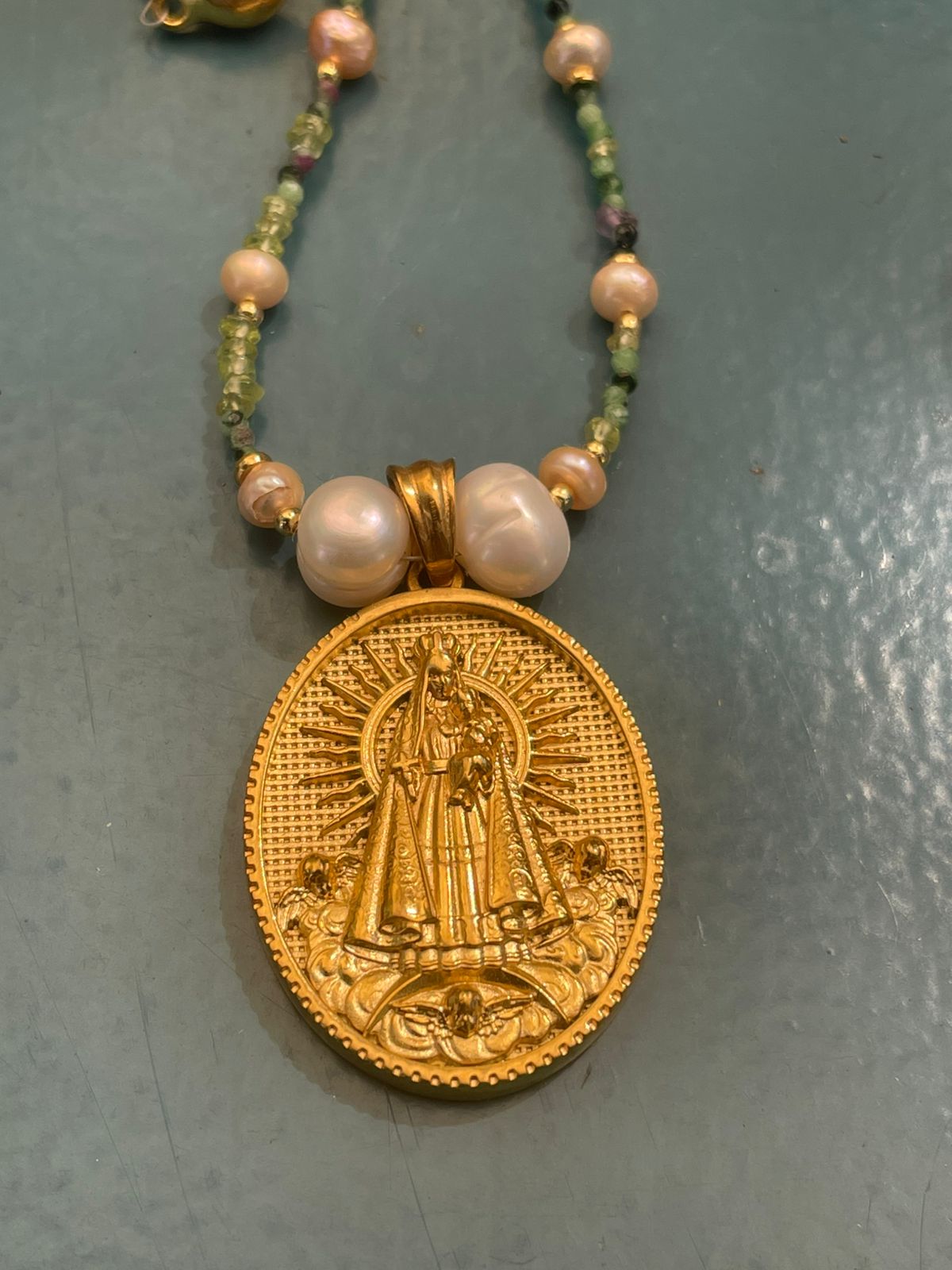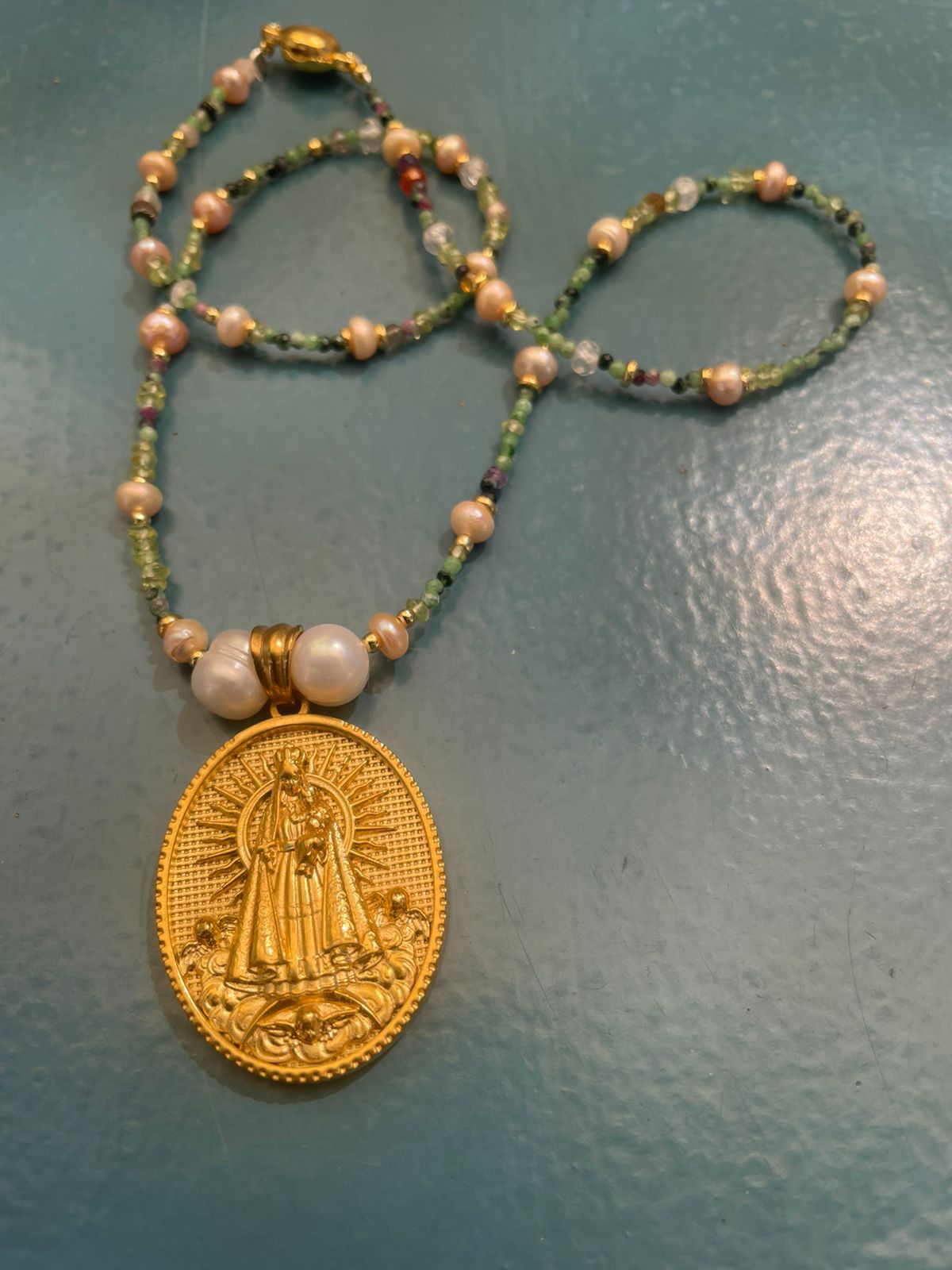 Collar de perlas peridot y pequeñas gemas cono ador por un medallón de la Virgen.
