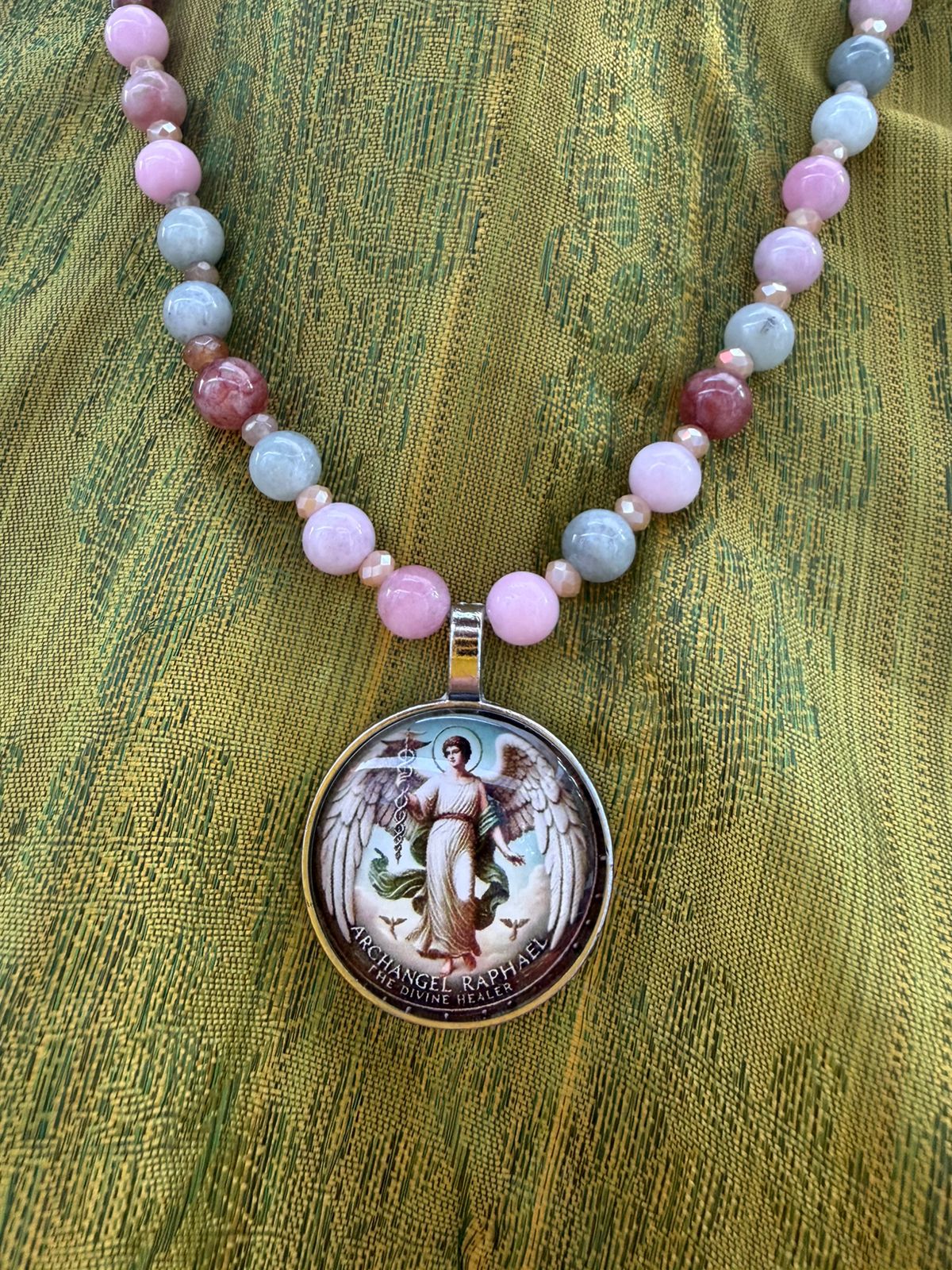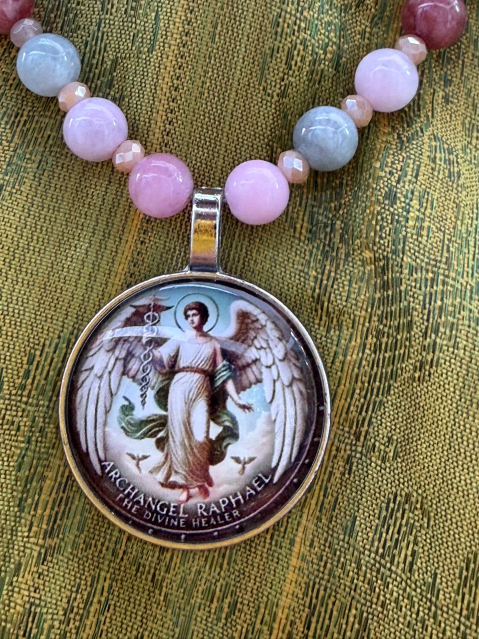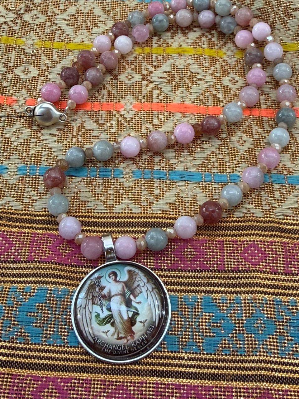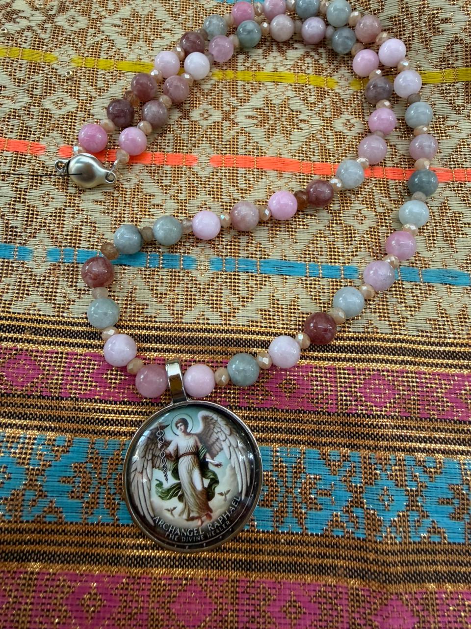 Este collar hilado con gemas verdes y rosas de elbaita está coronado con el talismán del arcángel Raphael. Al usarlo recita esta poderosa oración “Amado Arcángel Rafael, médico del cielo, bendice este talismán. Que sea un canal de tu luz sanadora para mi cuerpo, mi mente y mi espíritu. Que donde yo vaya, tu protección y salud me acompañen. Gracias porque ya está hecho.