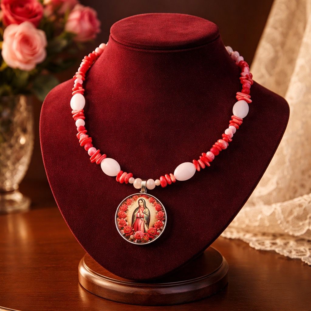 La virgen de Guadalupe milagrosa, hilada en cristal rosa, cuarzo rosa, rodocrosita y coral, un collar para la frecuencia del amor.
